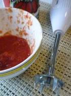 Most are hard-wired but some models come cordless with rechargeable batteries (I prefer the hard-wired ones -- they're much more robust) and some are sold with accessories like whisks or choppers. The most popular brands are Bamix, KitchenAid, Braun and Cuisinart and cost anywhere from $30 to $100. Mine is a Braun that I've had for longer than I can remember. I was recently given a Bamix with changeable blades, including one for whipping cream, but I prefer my Braun because it has a shield over the blades making for less spattering. I also confess to liking the way my old Braun looks -- very Bauhaus. An immersion blender works just as the name suggests: you immerse the wand into the ingredient so that the blade is below the surface and using the same hand with which you're holding the wand, you turn it on and off (there's often only one speed -- on). As long as the blade is in the food and as long as you keep it turned on, it will mix with a fury. If you lift the blade above the food while the blade is whirring, it will spatter and spit.