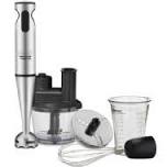 Set includes potato masher, 2-cup chopper with stainless steel blade,chef’s whisk,power handle,4-cup blending cup,blending shaft 700-watt Smart Stick hand blender reaches into pots, pitchers and bowls Ergonomically designed handle for comfort and ease of use Power lock/unlock feature for safe operation Stainless steel wrapped housing Variable speed knob for optimal control Long and slim shaft Product Warranty: 3 Year limited 17.3'' H x 3'' W x 3'' D