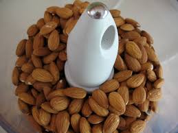 Place 4 to 6 ounces of your nut of choice in food processor: Question: What type of food processor do you use? Answer: I’m really not sure which brand I have as it was a gift from a friend who imports prototype appliances. However, when people ask, I always recommend Cuisinart or Hamilton Beach brand processors. If you have a membership to Costco, I would check out their selection as they often have great deals on the Cuisinarts, both at their stores and online. If you prefer roasted nut butter, simply place your raw nuts on a parchment or foil lined cookie sheet and roast in a 350 degree oven for 12 to 15 minutes, stirring once or twice to prevent burning. Turn the food processor on, and let it do it’s job. At first, you’ll have nothing but nut dust, & you’ll have to scrape down the sides of your processor several times with a rubber spatula: Allow the processor to continue running. Eventually, your nut butter will begin to clump: Let the processor continue running until nut butter reaches desired consistency.