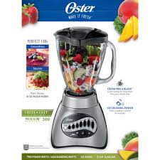 New (33) from $50.99 + $8.49 shipping Ships from and sold by eTronicspro in easy-to-open packaging. Oster® French Bull 18-Speed Blender Oster Reverse Crush Counterforms Blender, with 6-Cup Glass Jar, 7-Speed Settings and Brushed Stainless Steel/Black Finish Oster Pro 1200 Blender Plus 24 oz Smoothie Cup Oster 6811 6-Cup Glass Jar 12-Speed Blender, Brushed Nickel Oster 6812-001 Core 16-Speed Blender with Glass Jar, Black Just set the blending timer for up to 60 seconds and walk away; blender will automatically shut off once the cycle is complete.* 6-Cup glass jar (thermal shock tested to withstand extreme temperature changes from dishwasher to freezer)* Dishwasher safe* Boroclass glass* 450 Watts of ice crushing power* Stainless steel blade chops and grinds (for powerful crushing of frozen fruit and ice)* Timer mode automatically shuts off the cycle is complete* 2 oz. filler cap (doubles as a measuring cup)* Digital controls (easy to clean)* Pulse feature (for precise blending control)